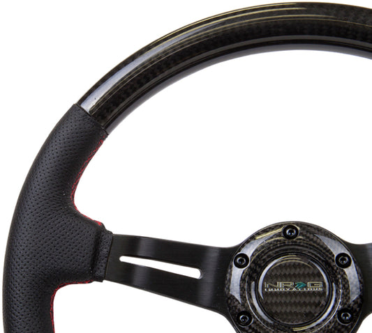 NRG Carbon Fiber Steering Wheel (350mm /1.5in. Deep) Leather Trim w/Red Stitch & Slit Cutout Spokes