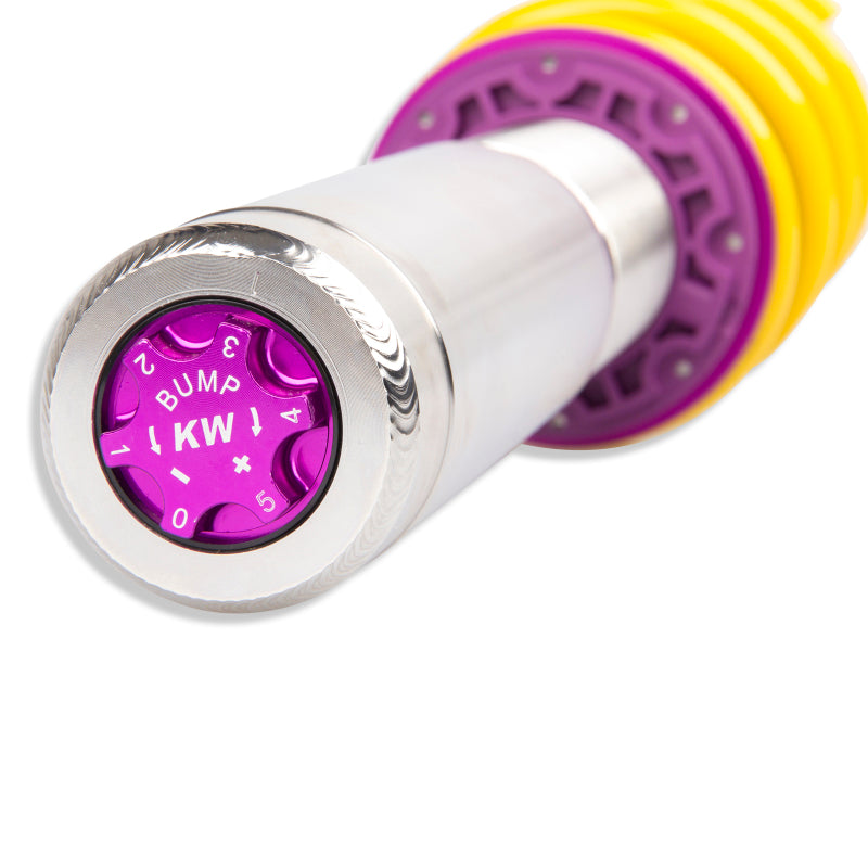 Cutting-edge motorsports technology for more performance on the road. Like every suspension product developed by KW automotive, the suspension manufacturer, and manufactured in Germany, the KW V3 Coilover suspension kit also provides a significant plus in safety reserves in road traffic. Thanks to the chassis with its high-quality dampers, springs, and elastomer spring elements, pitching and rolling movements during load changes such as evasive maneuvers, cornering, acceleration, and braking are significantly reduced. The braking distances are also shortened. Thanks to improved support and feedback, drivers not only feel safer but driving in everyday life becomes even safer. With compression and rebound stage damping, that can be set separately and independently of each other, the damper setup can be customized to y our personal driving preferences or vehicle changes such as weight, tire characteristics, or altered vehicle rigidity. True performance optimization is only possible with this unique, patented system. For example, this allows the compression damping force to be increased and get more grip from the tires, to improve cornering behavior and reduce squat without simultaneously altering the rebound stage damping which is optimally matched to the spring rate, a scenario which results in reduced grip and the associated loss of performance. The KW V3 coilover kit is the ideal tool for performance-oriented drivers and experienced tuning enthusiasts who place a strong emphasis on the overall performance of their suspension. The Variant 3 features patented TVR-A and TVC-A technology that provides separately adjustable rebound and compression damping. The extensive adjustment range of the independently configurable rebound and compression make it easy to directly influence the steering behavior, directional stability, grip and handling characteristics for confident and repeatable results at the limit of driving dynamics.